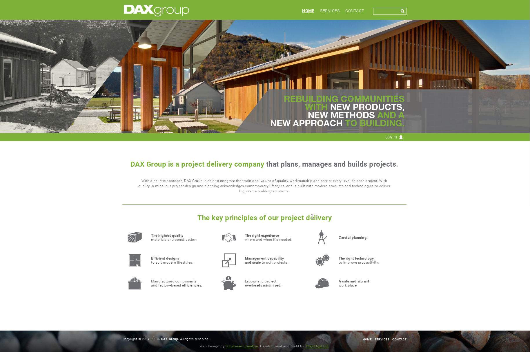 The DAXGroup mobile friendly website features a handful of public marketing pages including a clean concise homepage with carousel, a Services page and Contact page with embedded map. Each public page displays a different high resolution banner image show-casing a past DAXGroup project.